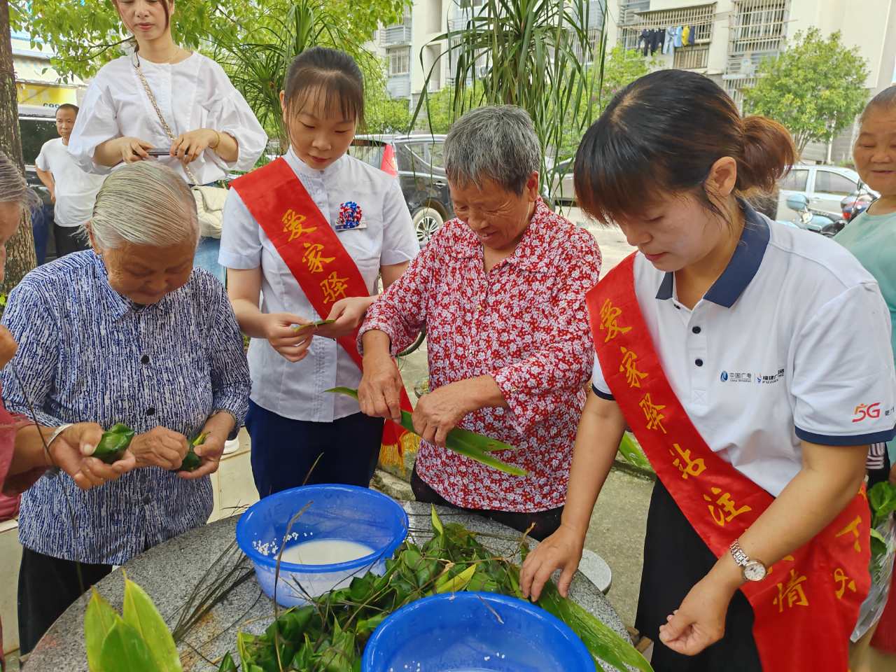 志愿者们早早的来到了活动现场,搬桌子,挂横幅,摆传单,热火朝天的准备着。围观的社区群众们也加入到帮忙的行列中。一切准备就绪,活动开始,志愿者们和社区群众一起包粽子,一张张翠绿的粽叶,一盆盆新鲜的糯米,一双双灵巧的手,一个个小巧可爱的粽子瞬间在阿姨大姐们的手里成形。大家谈笑风声,其乐融融,纷纷的说着端午节的各种民俗和传统故事,志愿者们也借着交谈的机会宣传了我们5G最新的业务。