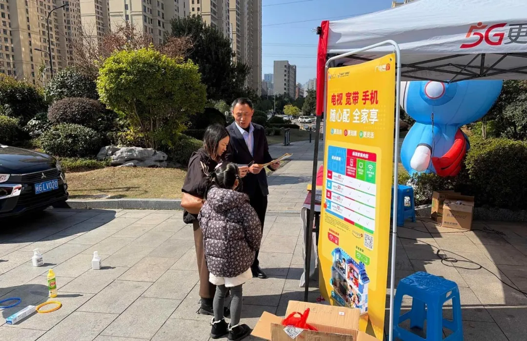 在东城悦府小区开展便民活动,免费检测信号,结合套圈游戏,提升服务口碑。